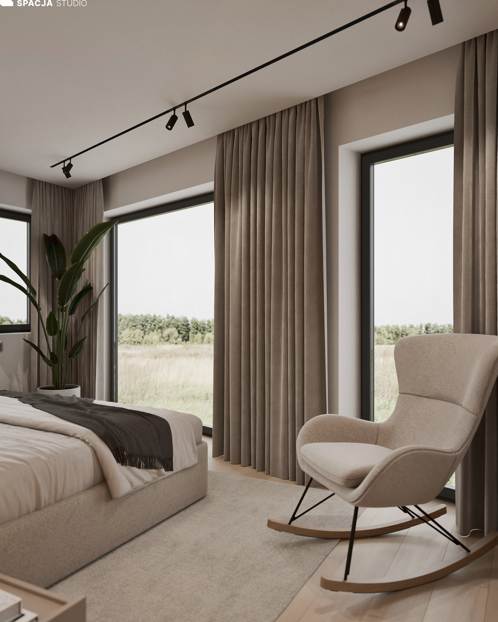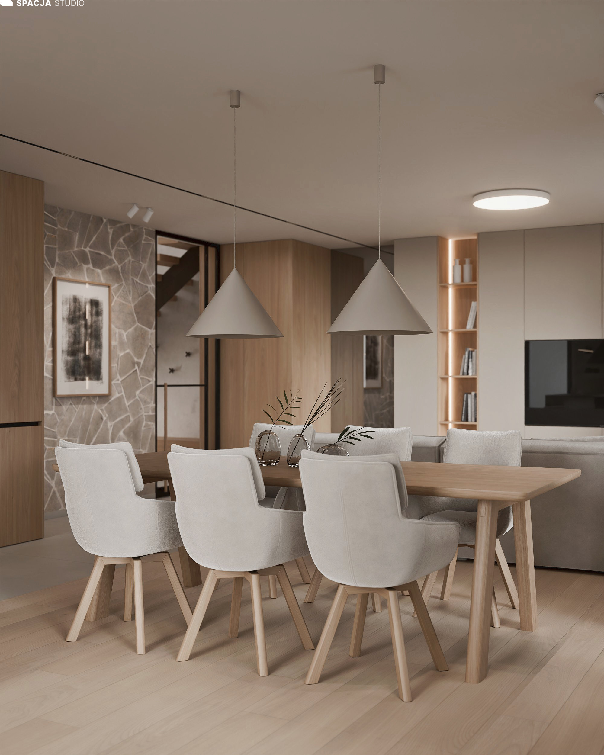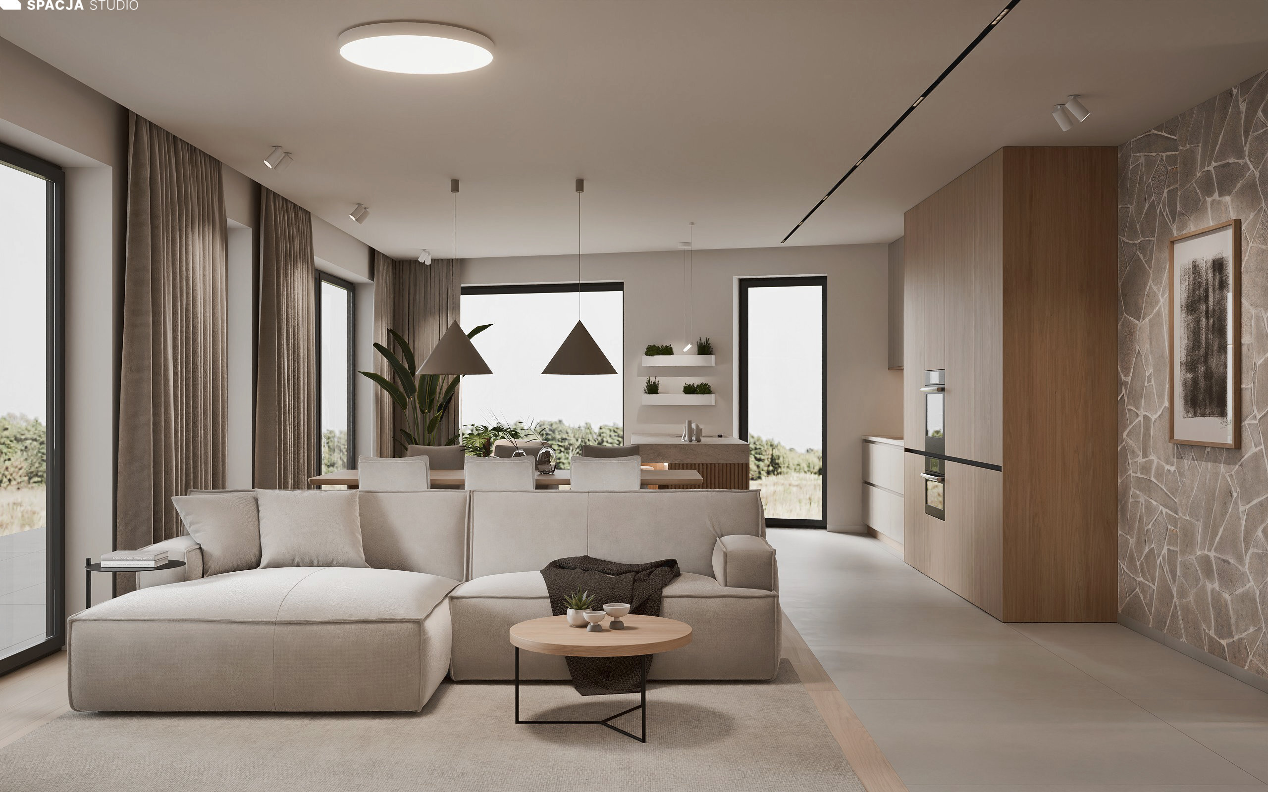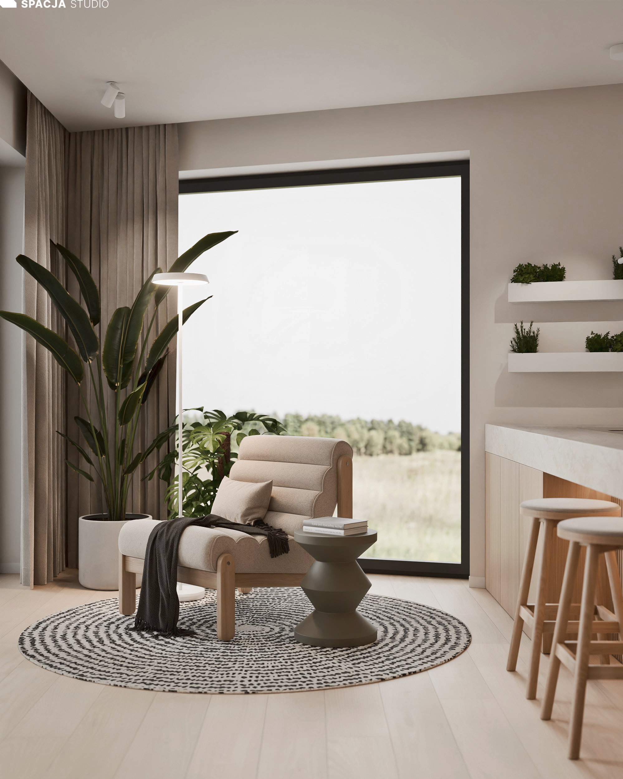 Projekt wnętrz domu na wsi powstał dla młodej rodziny. Ogromnym atutem domu są duże okna z pięknym widokiem, dlatego jego wnętrza zostały zaprojektowane tak, aby komponowały się z naturalnym krajobrazem.