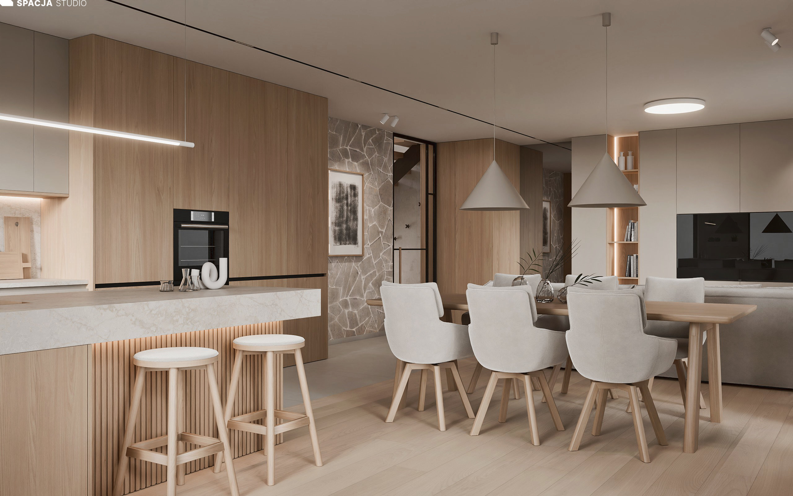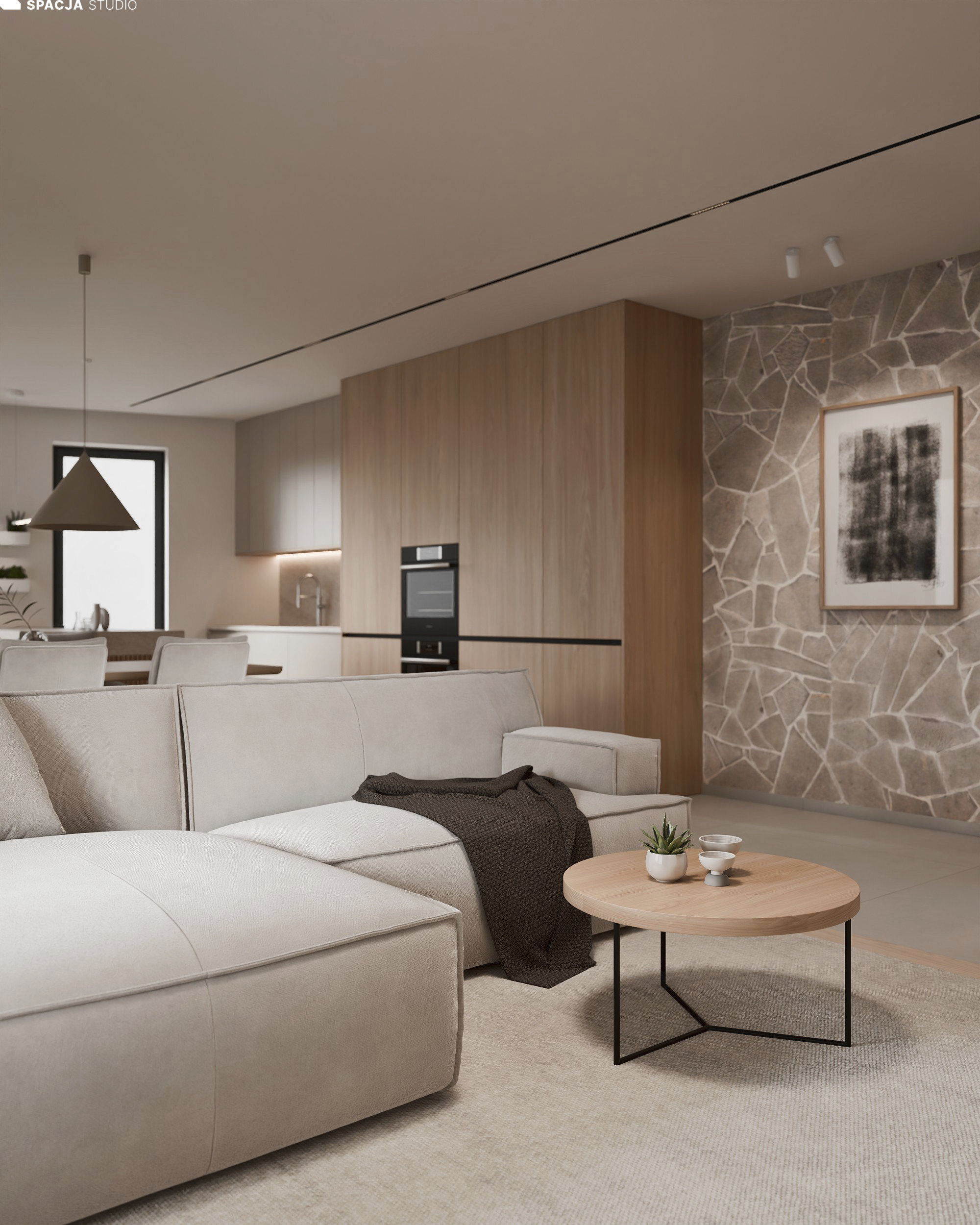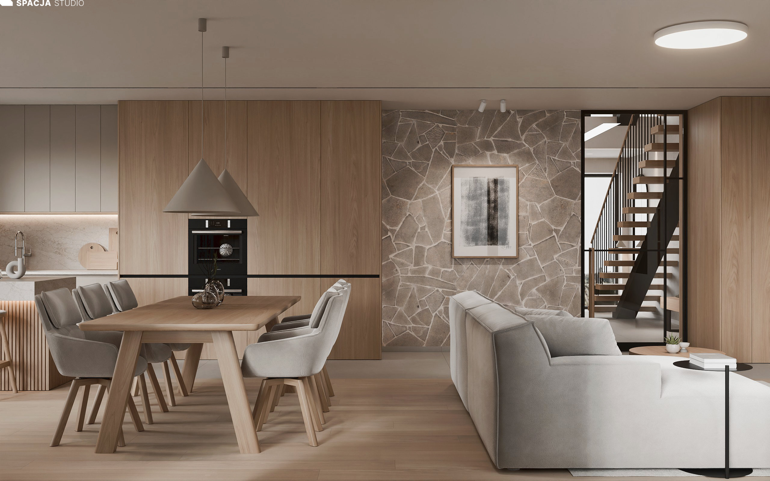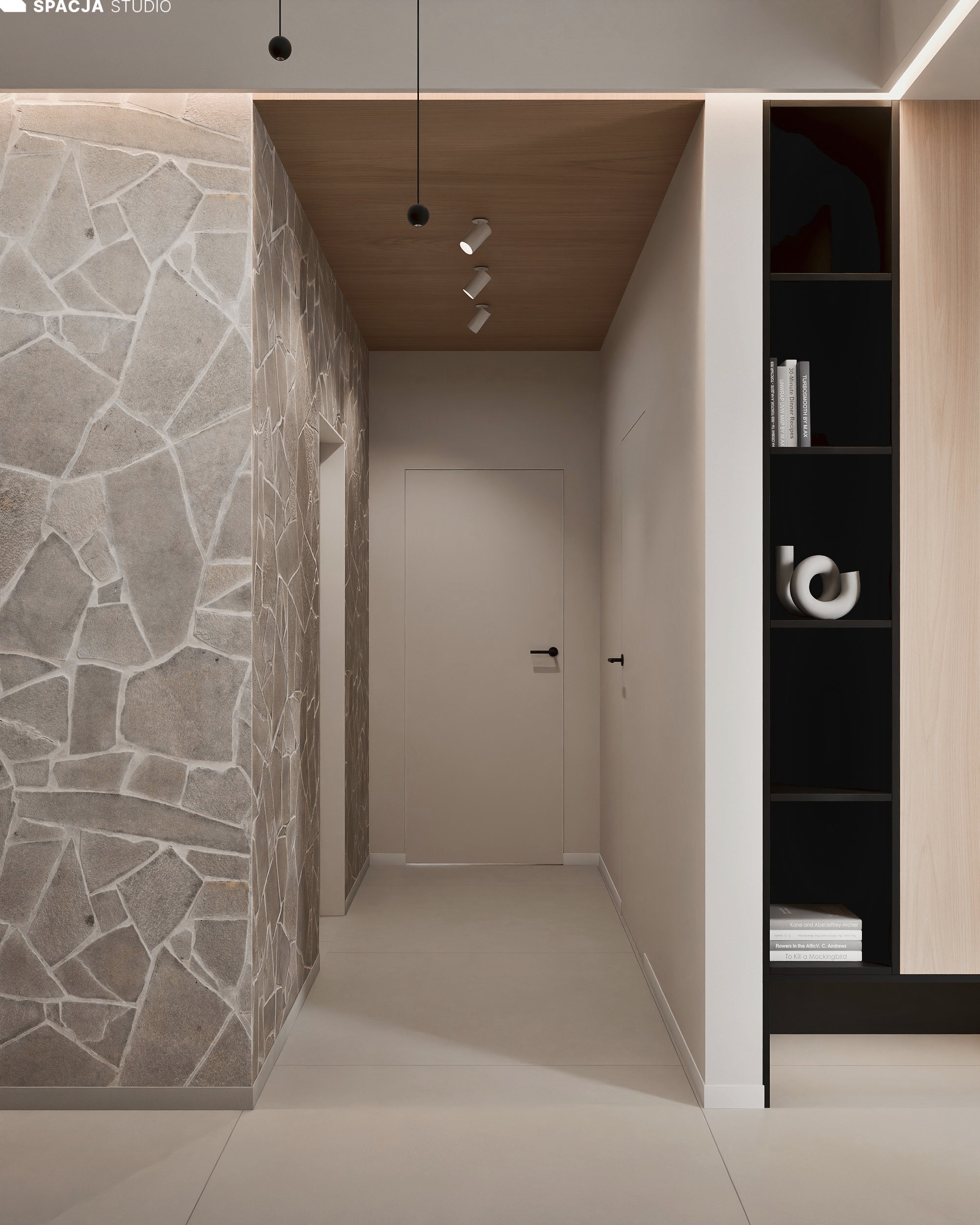 Neutralna, ciepła paleta barw opiera się głównie o beże i szarości, połączone z drewnem. Charakterystycznym elementem zastosowanym we wnętrzach jest okładzina ścienna z ciosanego kamienia.