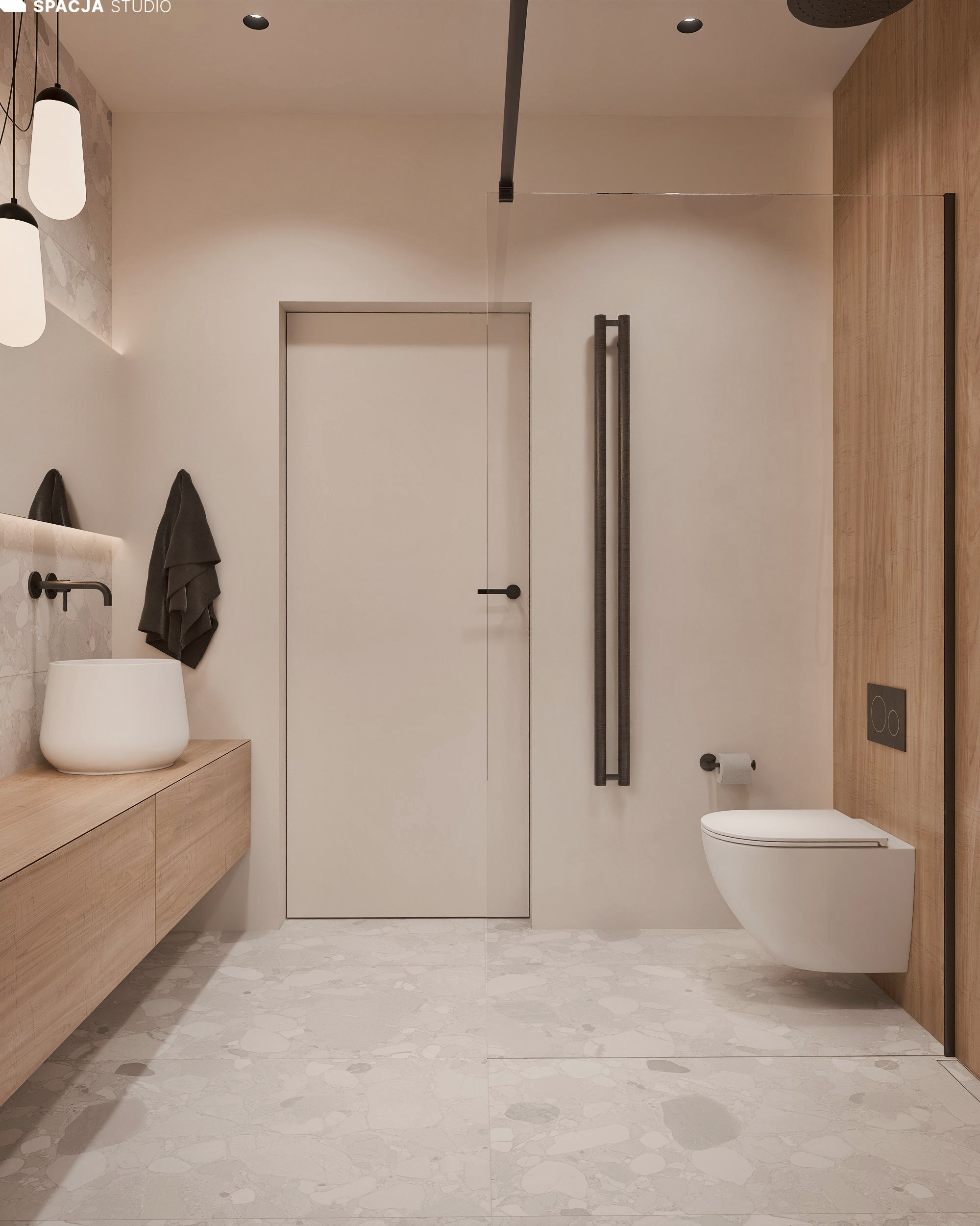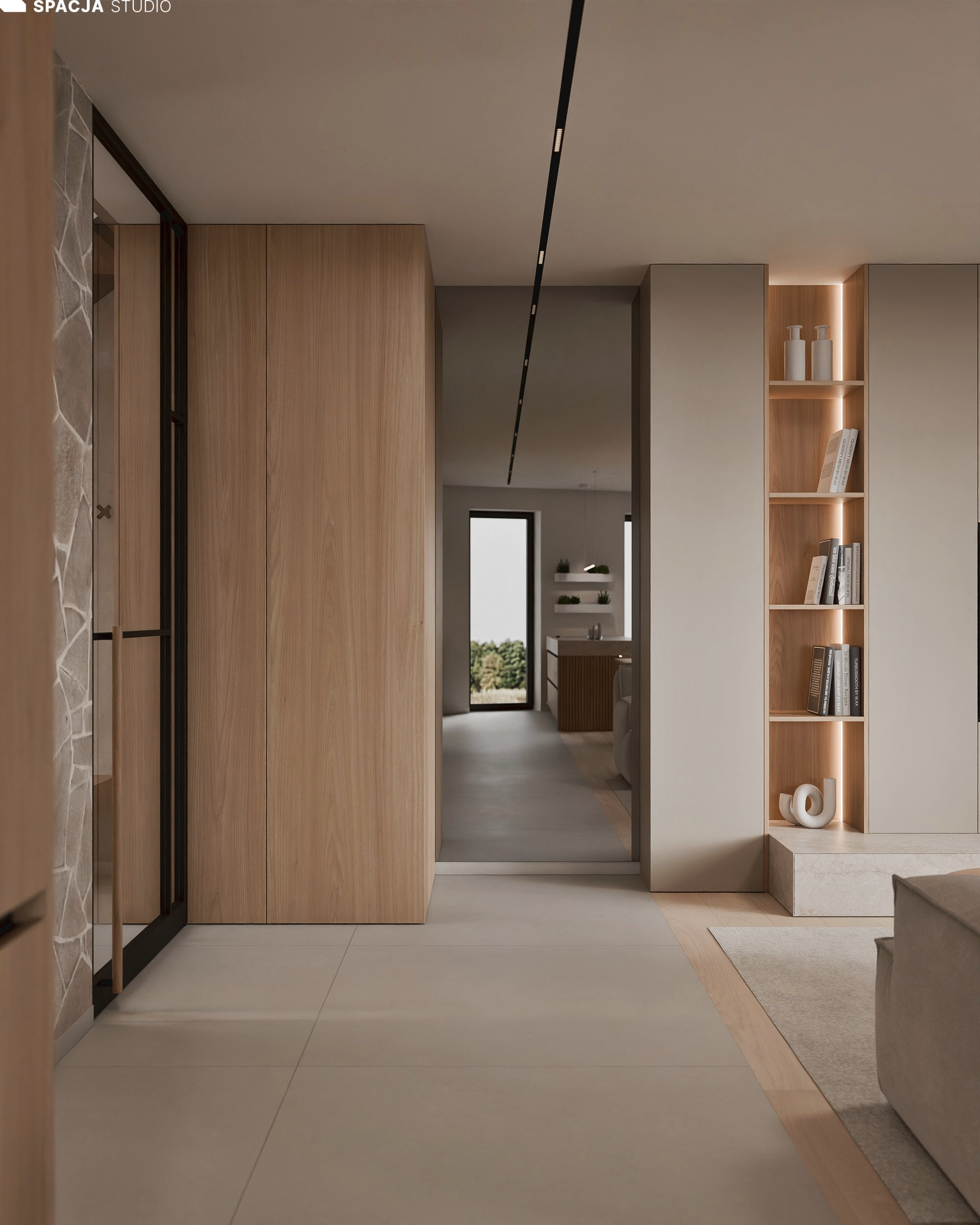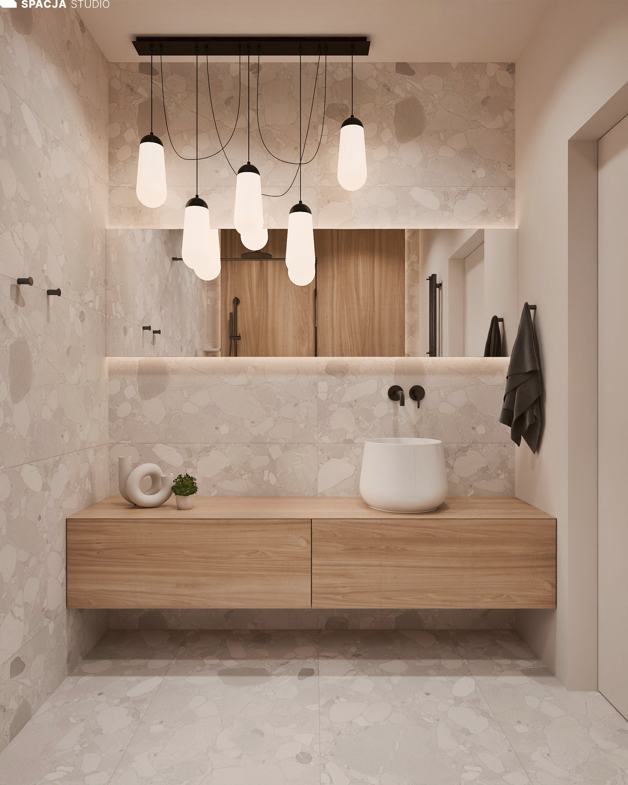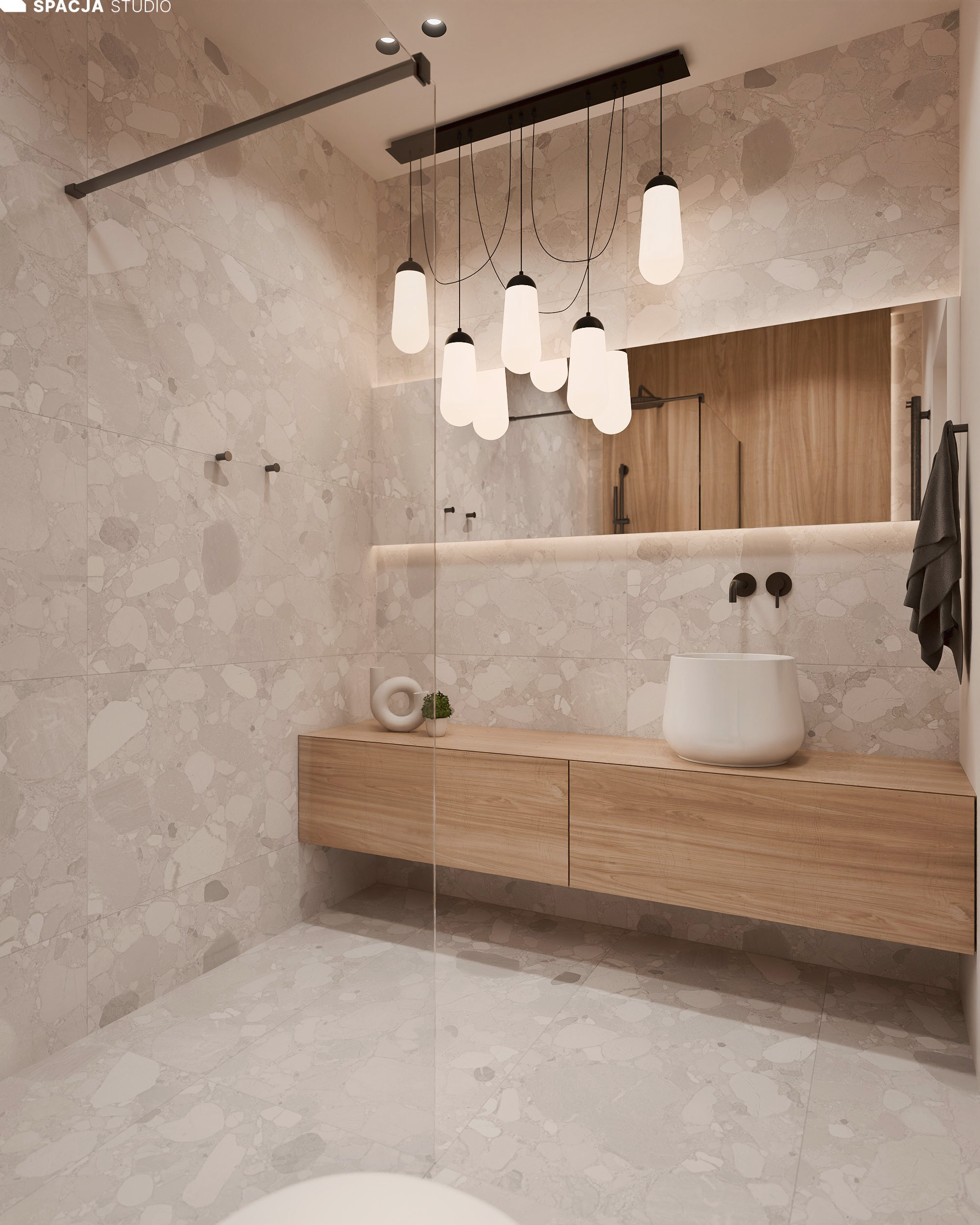 Neutralna, ciepła paleta barw opiera się głównie o beże i szarości, połączone z drewnem. Charakterystycznym elementem zastosowanym we wnętrzach jest okładzina ścienna z ciosanego kamienia.