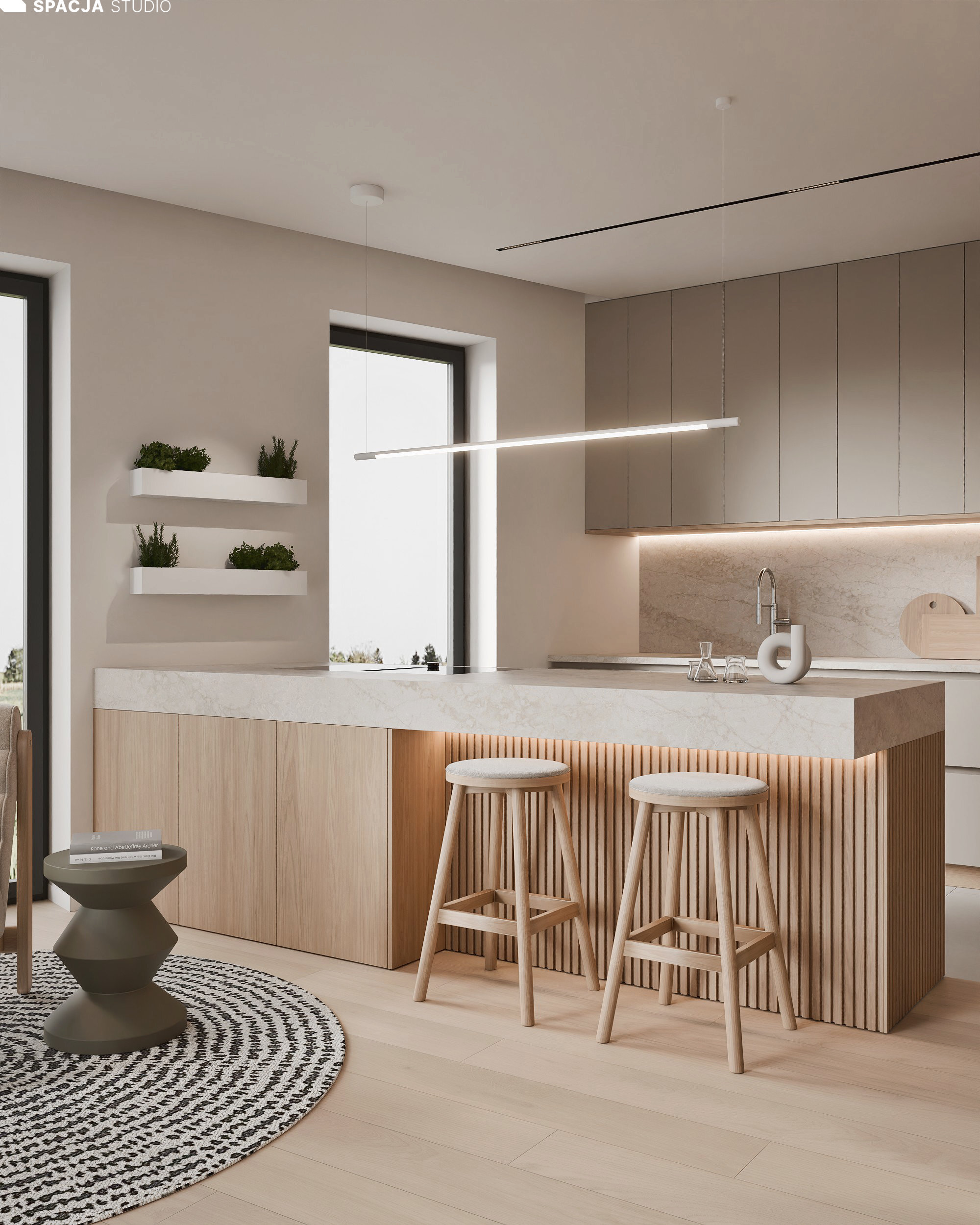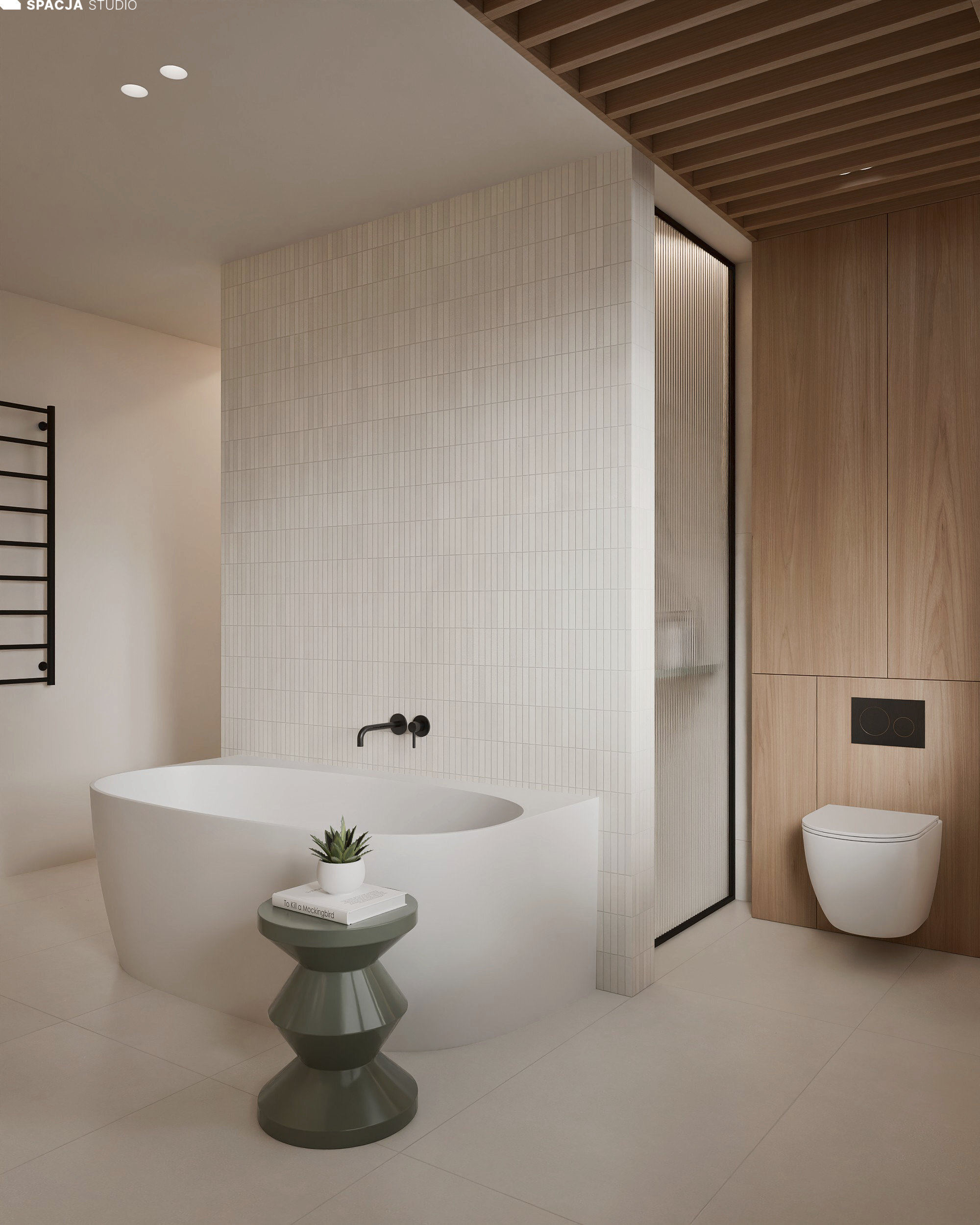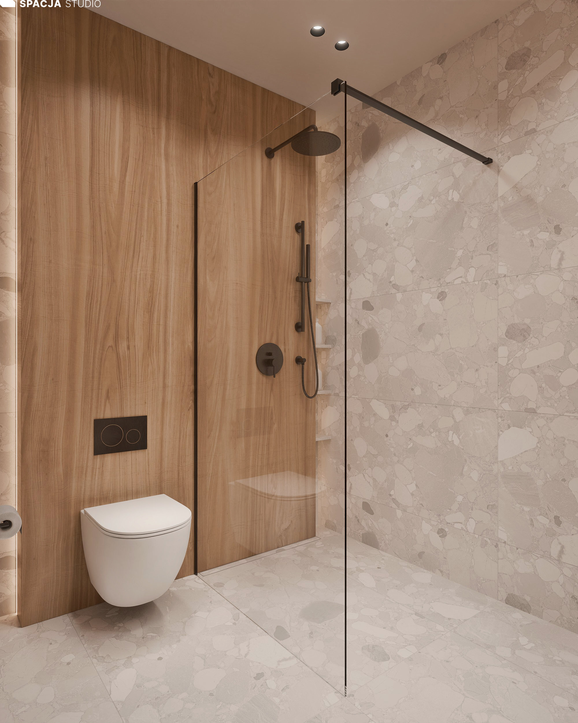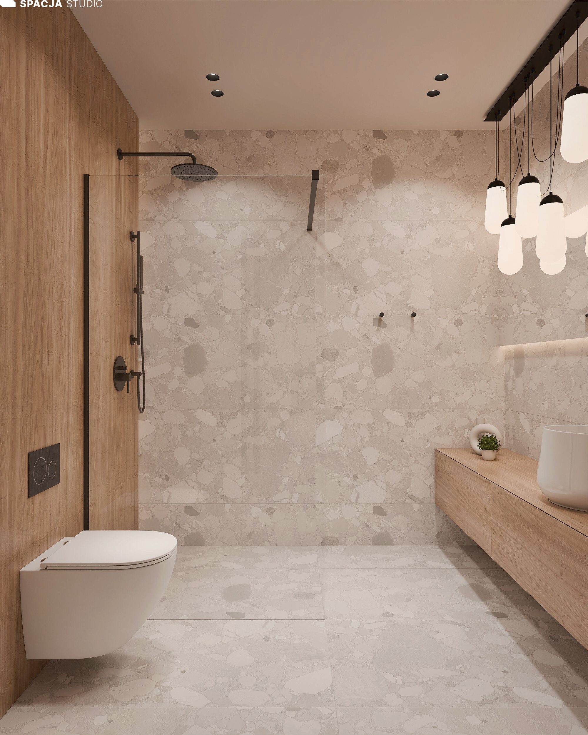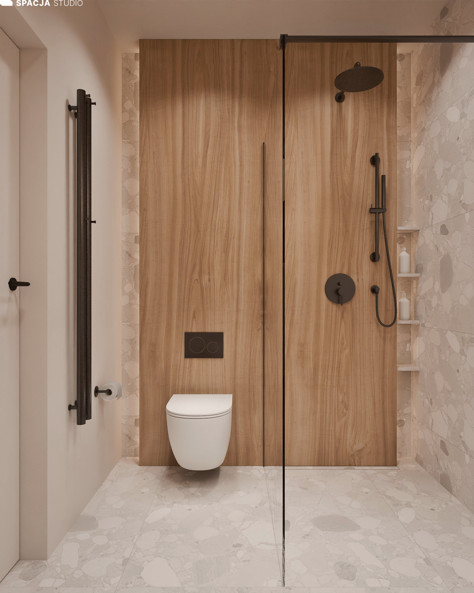 Neutralna, ciepła paleta barw opiera się głównie o beże i szarości, połączone z drewnem. Charakterystycznym elementem zastosowanym we wnętrzach jest okładzina ścienna z ciosanego kamienia.