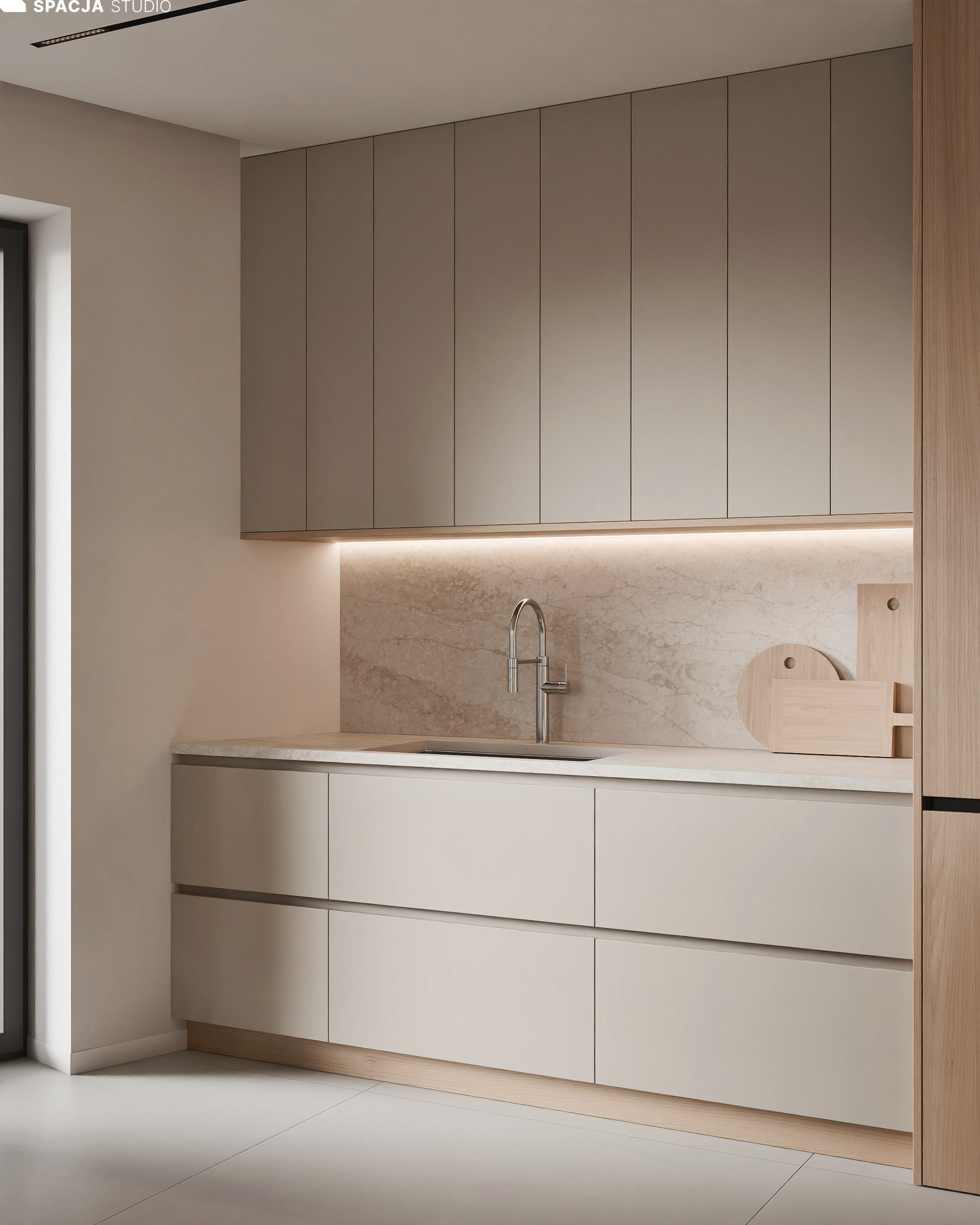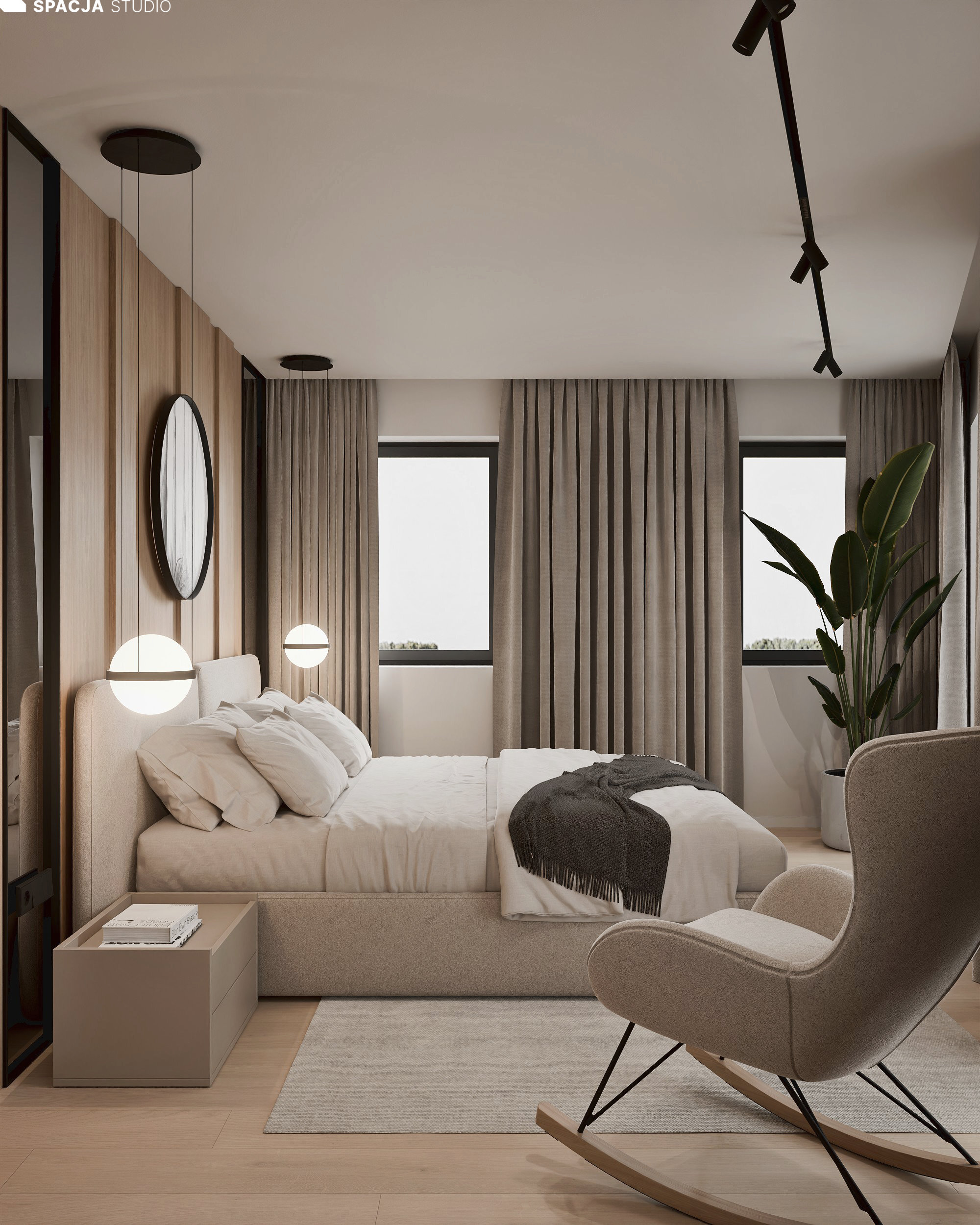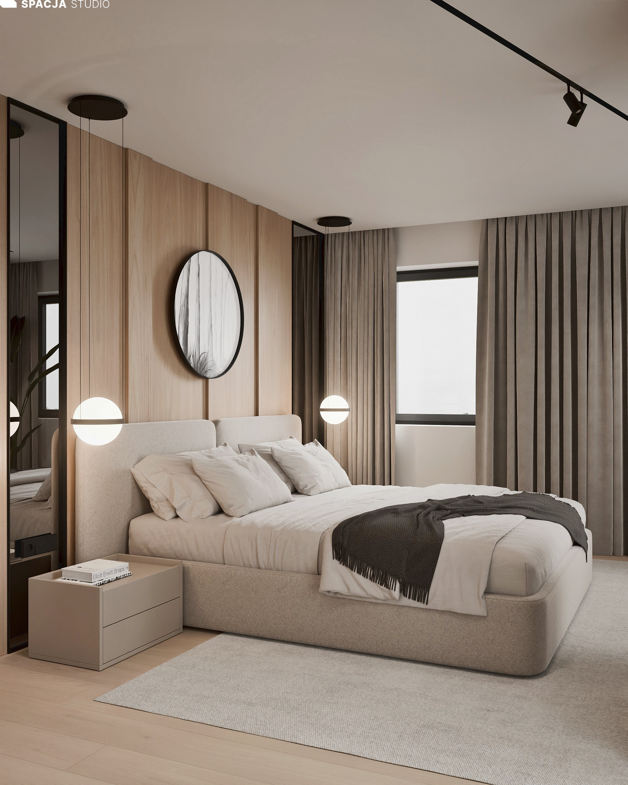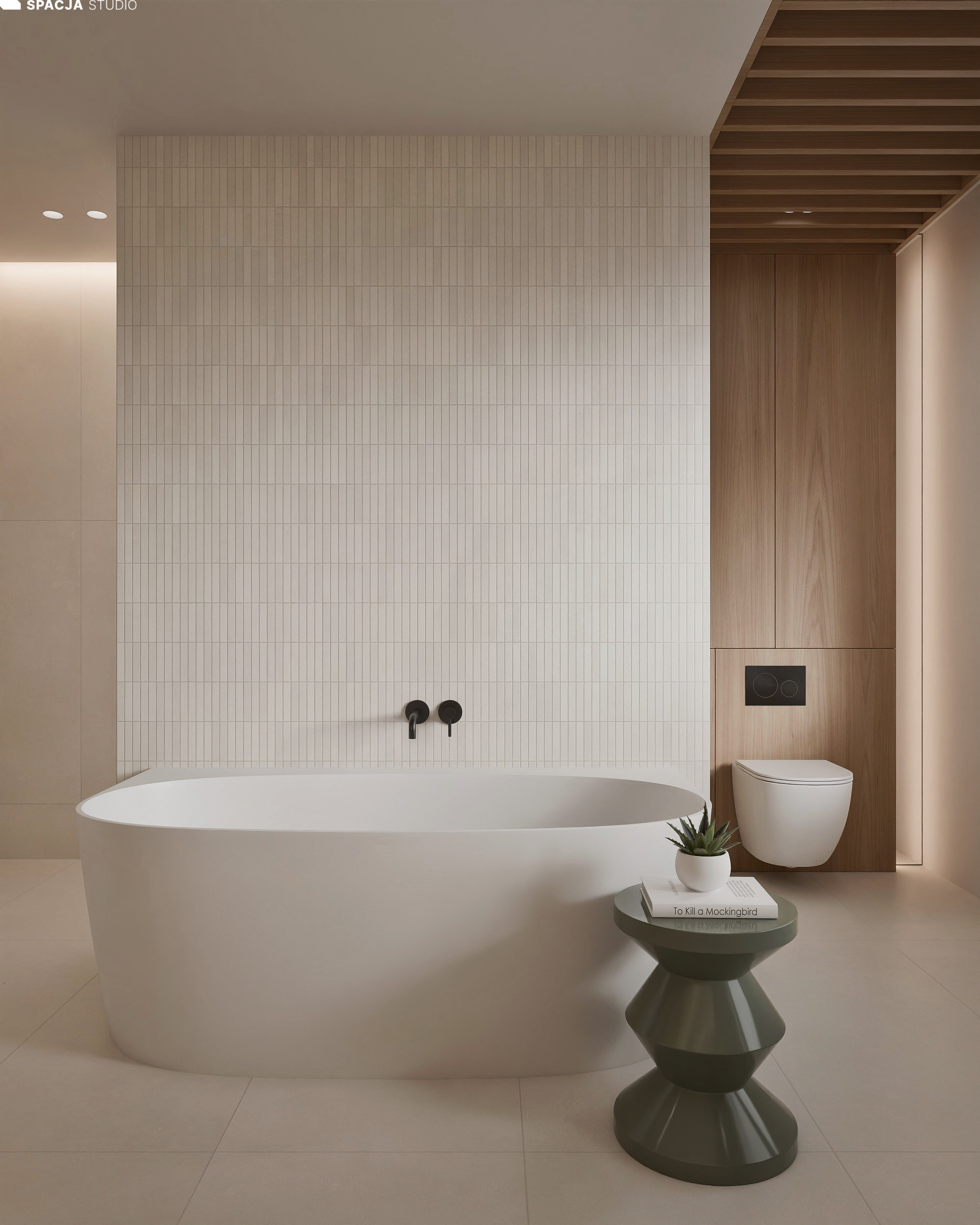 Neutralna, ciepła paleta barw opiera się głównie o beże i szarości, połączone z drewnem. Charakterystycznym elementem zastosowanym we wnętrzach jest okładzina ścienna z ciosanego kamienia.
